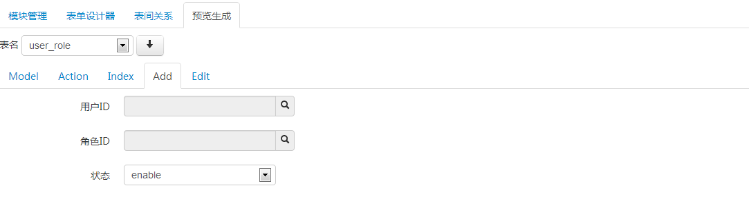 添加和修改界面生成时只要将数据库表字段类型与表单类型对应即可,比如varchar生成文本框,enum生成列表框。