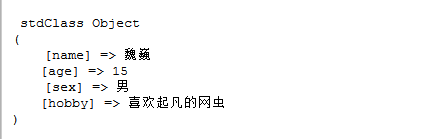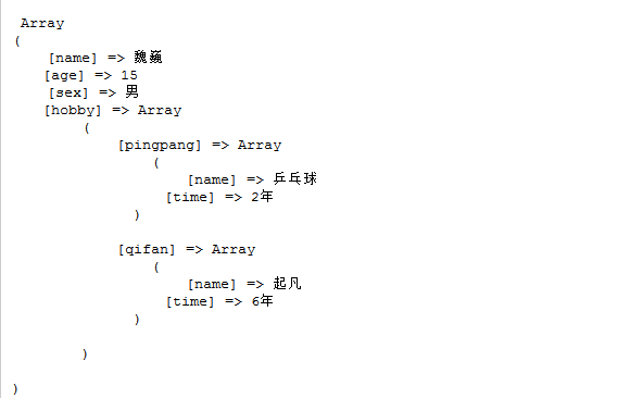 $data = array('name' =>'魏巍' ,'age'=>15,'sex'=>'男','hobby'=>'喜欢起凡的网虫' );