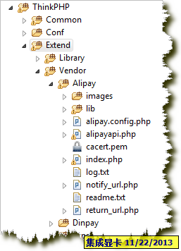 前往ThinkPHP目录下的Extend,找到Vendor目录(这个目录是第三方类库的存放目录,如果没有,手动创建一个,要标准版本里面是没有的),然后在Vendor下创建Alipay目录存在支付宝相关的文件。