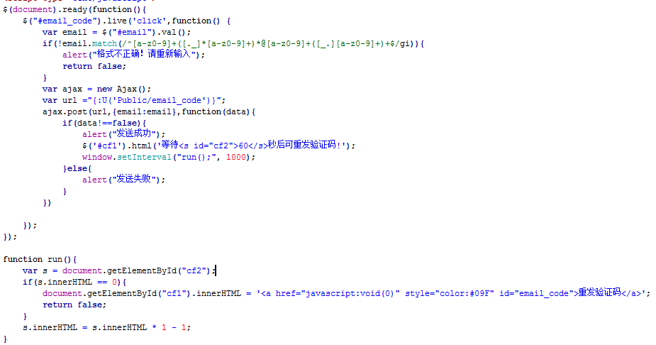 //控制器是 {:U('Public/email_code')} 发送成功返回1 失败反回0