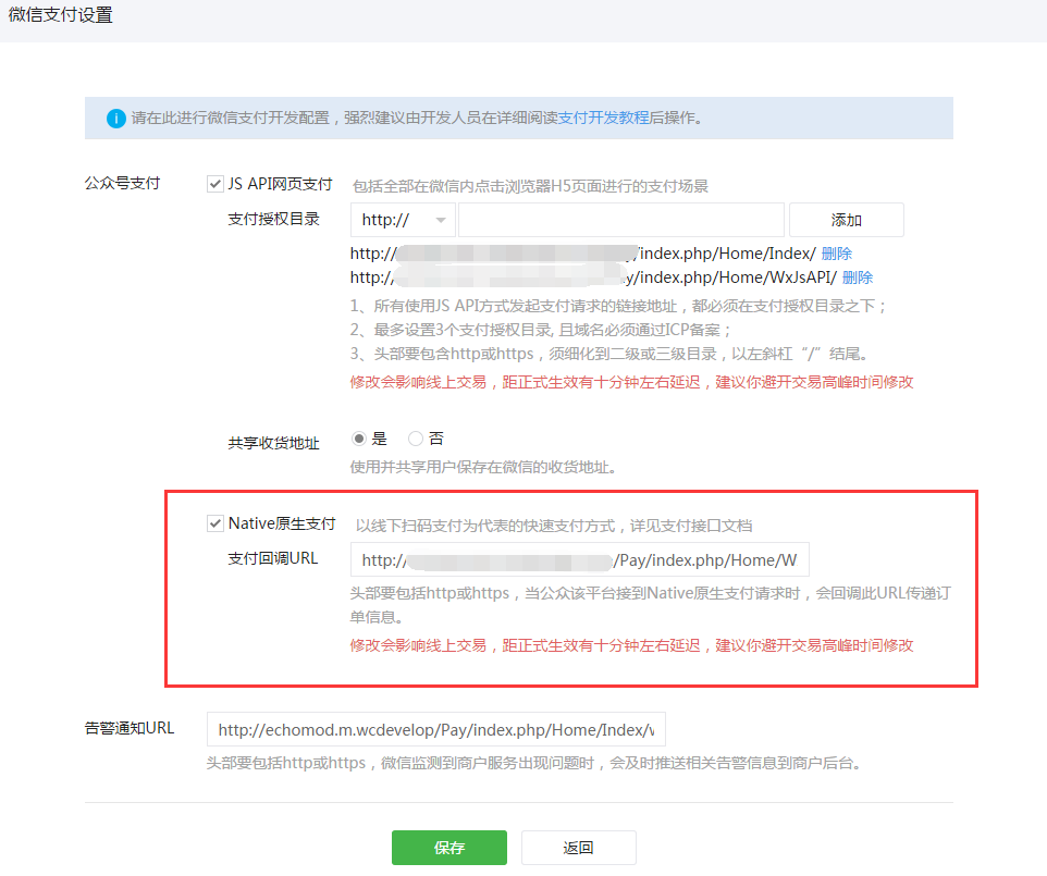 公众平台navtive配置:配置地址 http://您的域名/Pay/index.php/Home/WxNative/todoPost