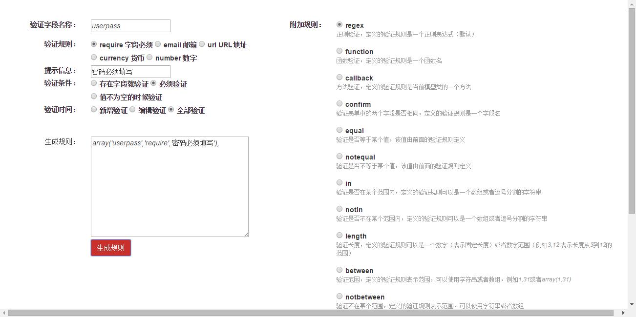 <p>验证是否在某个范围内,定义的验证规则可以是一个数组或者逗号分割的字符串</p>