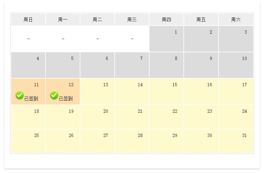 </html>这里需要依赖的是两个文件,一个是CSS,一个是JQ。这里的话CSS我就不拿出来了,需要的可以去素材火注册然后另存为他的签到的CSS样式,JQ的是1.11.0.min.js,这个自行下载function getSign($row) {