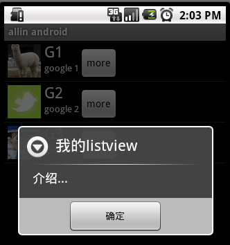 系统显示列表时,首先实例化一个适配器(这里将实例化自定义的适配器)。当手动完成适配时,必须手动映射数据,这需要重写getView()方法。系统在绘制列表的每一行的时候将调用此方法。getView()有三个参数,position表示将显示的是第几行,covertView是从布局文件中inflate来的布局。我们用LayoutInflater的方法将定义好的vlist2.xml文件提取成View实例用来显示。然后将xml文件中的各个组件实例化(简单的findViewById()方法)。这样便可以将数据对应到各个组件上了。但是按钮为了响应点击事件,需要为它添加点击监听器,这样就能捕获点击事件。至此一个自定义的listView就完成了,现在让我们回过头从新审视这个过程。系统要绘制ListView了,他首先获得要绘制的这个列表的长度,然后开始绘制第一行,怎么绘制呢?调用getView()函数。在这个函数里面首先获得一个View(实际上是一个ViewGroup),然后再实例并设置各个组件,显示之。好了,绘制完这一行了。那再绘制下一行,直到绘完为止。在实际的运行过程中会发现listView的每一行没有焦点了,这是因为Button抢夺了listView的焦点,只要布局文件中将Button设置为没有焦点就OK了。