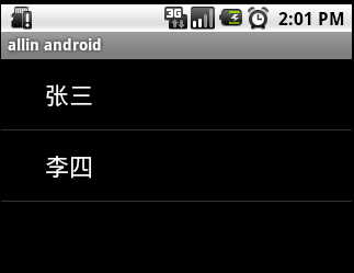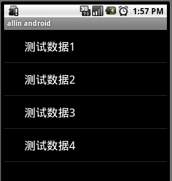上面代码使用了ArrayAdapter(Contextcontext, int textViewResourceId,List<T> objects)来装配数据,要装配这些数据就需要一个连接ListView视图对象和数组数据的适配器来两者的适配工作,ArrayAdapter的构造需要三个参数,依次为this,布局文件(注意这里的布局文件描述的是列表的每一行的布局,android.R.layout.simple_list_item_1是系统定义好的布局文件只显示一行文字,数据源(一个List集合)。同时用setAdapter()完成适配的最后工作。运行后的现实结构如下图: