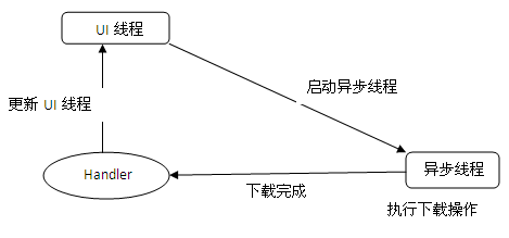 启动一个新的线程来获取资源,完成后通过Handler机制发送消息,并在UI线程中处理消息,从而达到在异步线程中获取图片,然后通过Handler Message来更新UI线程的过程。