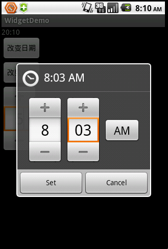 timePicker=(TimePicker)findViewById(R.id.timePicker); timePicker.setCurrentHour(16); timePicker.setCurrentMinute(10); updateDisplay(16,10); timePicker.setOnTimeChangedListener(this);