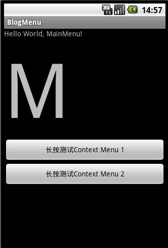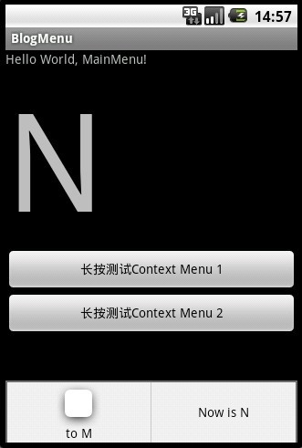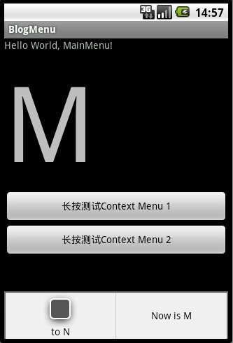 动态菜单就是根据不同的界面有不同的菜单。下面的代码实现这样的功能:当主界面的某个TextView的值是“M“和“N”时,弹出不同的菜单。