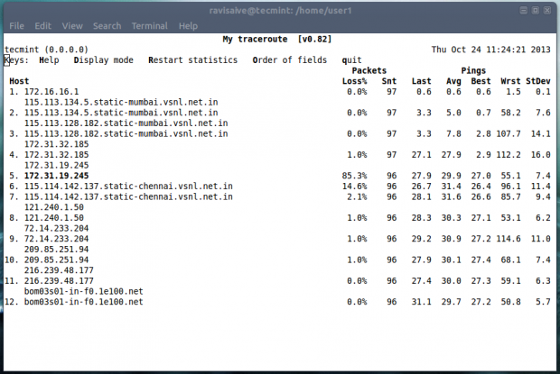 现在运行mtr命令,开始查看mtr运行的主机和google.com直接的网络连接。