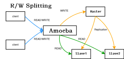 要实现这种方式,需要程序特别设计,写都操作master,读都操作slave,给程序开发带来了额外负担。当然目前已经有中间件来实现这个代理,对程 序来读写哪些数据库是透明的。官方有个mysql-proxy,但是还是alpha版本的。新浪有个amobe for mysql,也可达到这个目的,结构如下