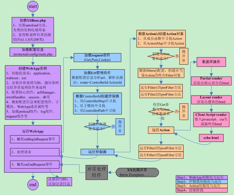 对于刚接触框架的新同学,特别是对那些只学习了PHP的基础知识而没有接触过MVC模式的同学来说,Yii框架无疑是有点难度的,刚开始真是一头雾水。就像我当初刚接触Yii一样,习惯了原生代码的一步一个逻辑的写,突然给我Model,给我Controller,给我View,我真的傻眼了,为什么在Controller中返回的内容就到view中了啊;为什么Model中的属性和方法直接可以用,而不用include或者require进来啊;为什么不需要写连接数据库的代码啊…这一系列问题劈头盖脸的扇来,着实让新手苦不堪言! 今天和大家分享一张我自己当时学习Yii时收藏的一张Yii执行流程图,虽然对新手来说有些看上去还是糊里糊涂的,但我想先纵观全局再各个击破就会有方向了,不会小鹿乱撞啦~下面上图…