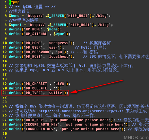 然后,编辑wp-config.php文件,在图示位置加入"define('DB_TYPE','sqlite')"。