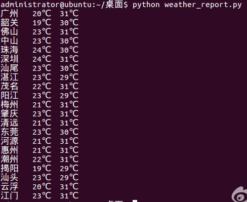 这个天气预报采集是从中国天气网提取广东省内主要城市的天气并回显。本来是打算采集腾讯天气的,但是貌似它的数据是用js写上去还是什么的,得到的html文本中不包含数据,所以就算了。