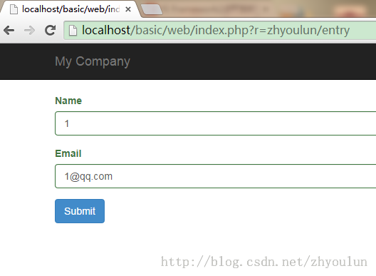 类ZhyoulunController中函数actionEntry() ,其中有一句$model->validate(),就是来判断输入的名字和电子邮件是否正确。
