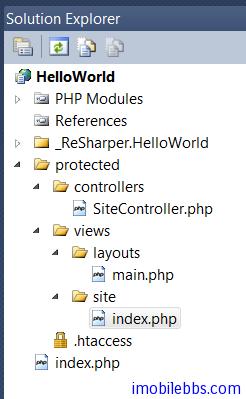 Yii应用本身有很多配置,比如确省的Controller ,action是否使用Log文件等。对于Hello,World这个简单的应用,就全部使用缺省值。缺省的Controller为SiteController, Action为indexAction. 也就是说,比如你的网站为www.guidebee.com ,如果你采用Yii Framework, 用户请求www.guidebee.com时,Yii 应用的CWebApplication 将创建类SiteController的实例并调用SiteController的indexAction方法,(相当于C# Console应用的Program 的main方法)。