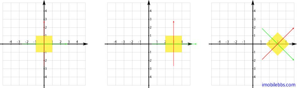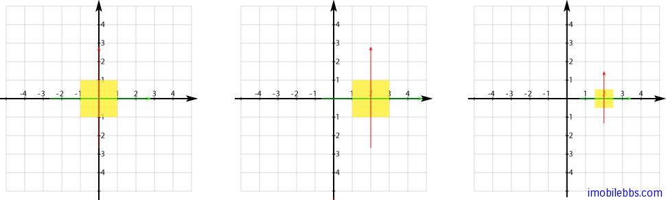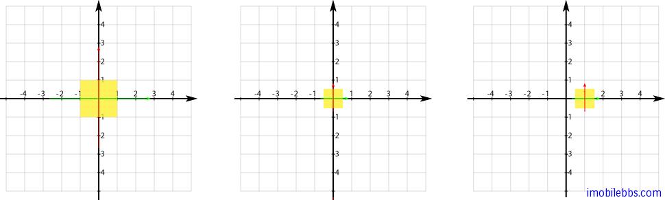 在上个例子中我们把需要显示的正方形后移了4个单位,就是使用的坐标的平移变换,可以进行多次平移变换,其结果为多个平移矩阵的累计结果,矩阵的顺序不重要,可以互换。