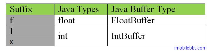 在前面Android OpenGL ES 开发中的Buffer使用 说过OpenGL ES 说过为了提高性能,通常将顶点,颜色等值存放在java.nio 包中定义的Buffer类中。下表列出了OpenGL ES指令后缀, Java类型,Java Buffer(java.nio)类型的对照表