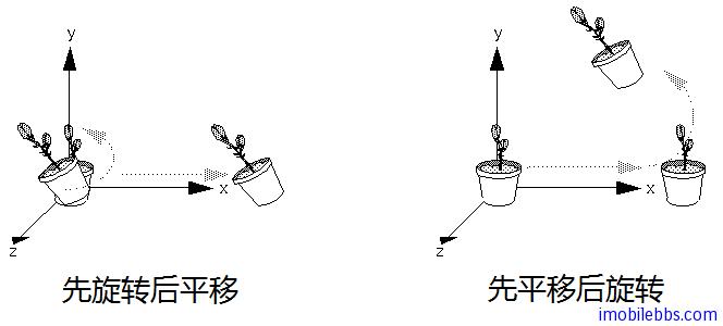 如果先旋转物体然后再平移,旋转后的物体的位置在X轴上面,但如果先平移后绕原点旋转物体,最终物体会出现在y=x 的直线上: