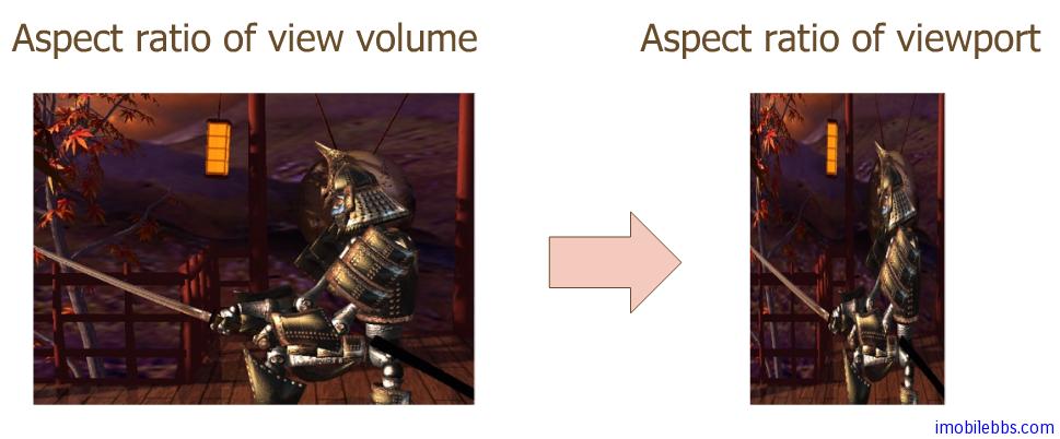 如果投影变换的宽度/高度比 (aspect) 和最后的Viewport 的width/height 比不一致的话,最后显示的图形就可能需要拉伸以适应Viewport,从而可能造成图像变形。比如:现在的电视的显示模式有4:3 和 16:9 或是其它模式,如果使用16:9的模式来显示原始宽高比为4:3的视频,图像就有变形。、