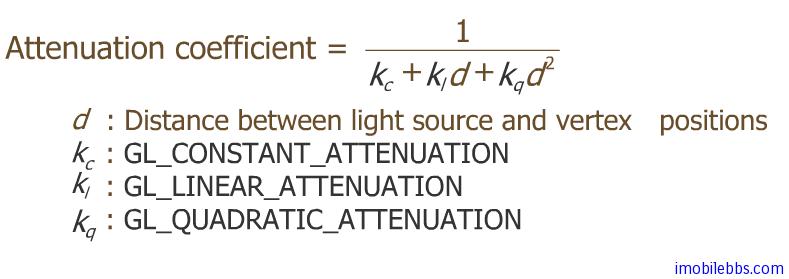 对应点光源(包括聚光灯),其它几个参数GL_CONSTANT_ATTENUATION, GL_LINEAR_ATTENUATION, GL_QUADRATIC_ATTENUATION 为点光源设置光线衰减参数,公式有如下形式,一般无需详细了解: