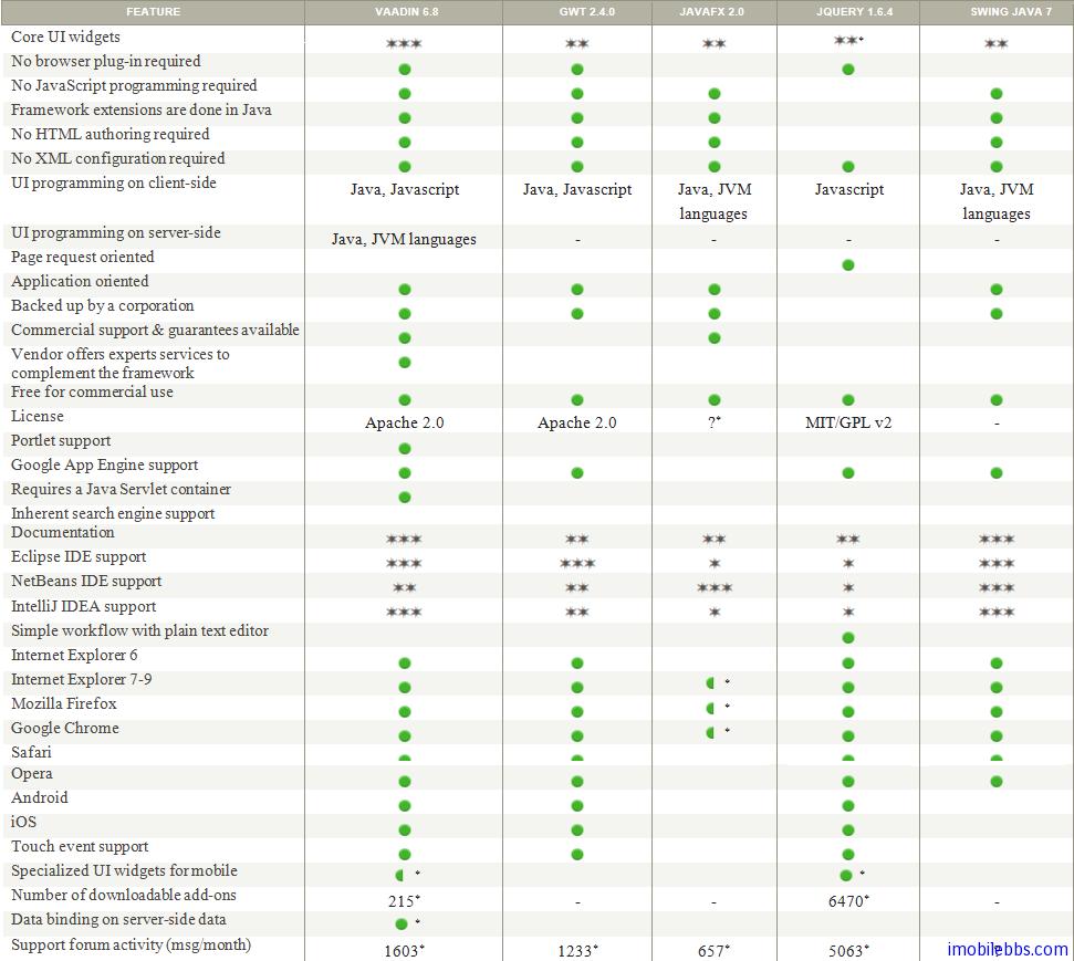 下表为Vaddin 应用程序框架和其它一些应用程序框架的比较: