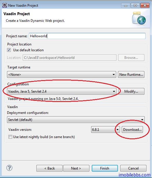 项目名称:Helloworld, 其它使用缺省值,Vaadin 当前版本为 6.8.1 , 如果你没有下载,可以选择Download ,自动下载到本地。