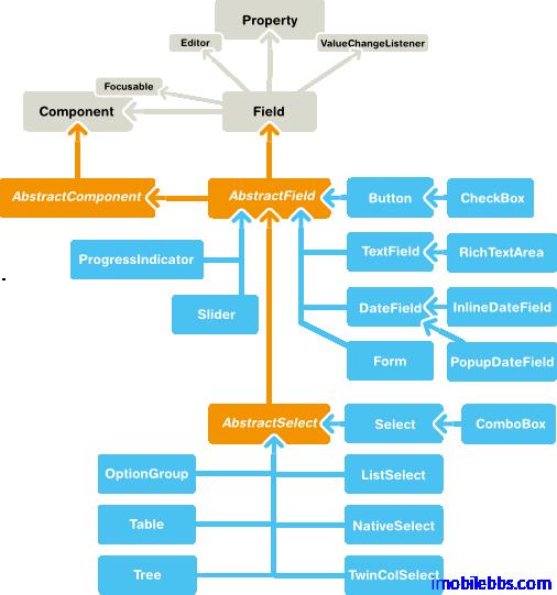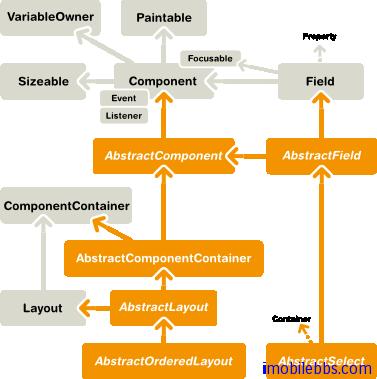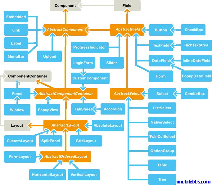 所用UI 组件都实现Component接口,AbstractComponent为所有UI 组件的根类,它有两个直接子类: AbstractField(实现Field接口),它提供了对数据绑定的支持。另外一个子类为AbstractComponentContainter,为所有容器类(Container)和布局类(Layout)的父类。对于一些不需要支持数据绑定的类,如Label,Link 等直接由AbstractComponent派生。