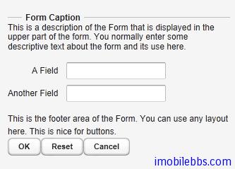 和大部分UI组件不同的是,Form构造函数不支持传入窗体标题参数,因为From经常不需要显示标题。你可以使用setCaption 为窗体添加标题。setDescription 可以为窗体添加帮助提示。Form组件缺省使用FormLayout 布局,但你可以使用setLayout 为Form组件设置其它Layout对象。