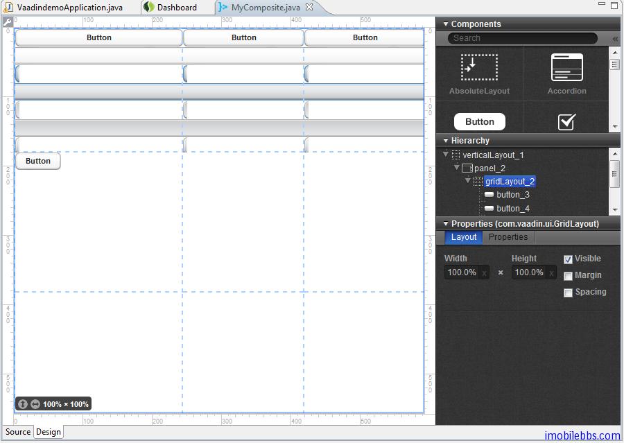 如果你使用过其它界面设计工具,如Visual Studio等,也就比较容易使用Vaadin的界面编辑器来设计UI界面,这里就不详述了。