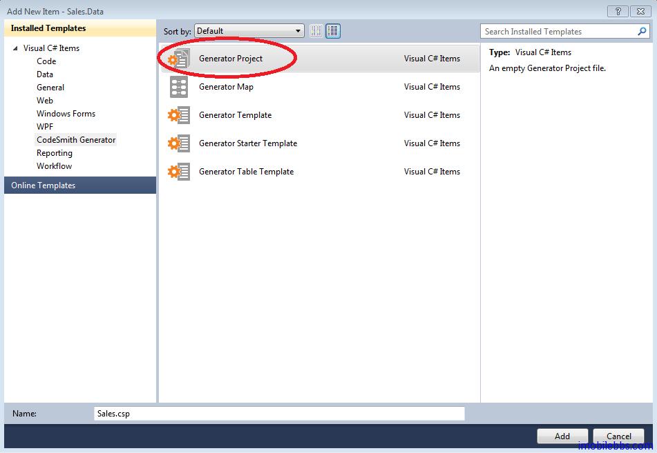 3. 在这个solution 中添加一个Sales.Data Class Library. 然后在项目中添加一个CodeSmith 项目Item