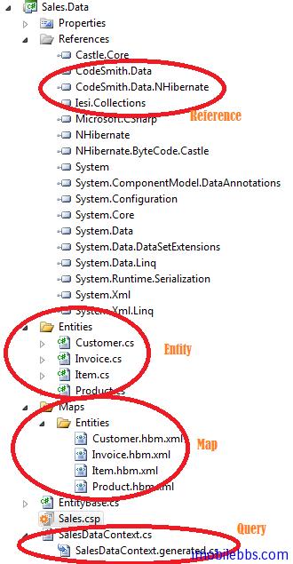 使用Visual Studio 2010 ,Codesmith 安装时提供了Visual Studio 插件支持。使用的示例数据库也是Sales,可以参见Hibernate开发教程(2):准备开始。