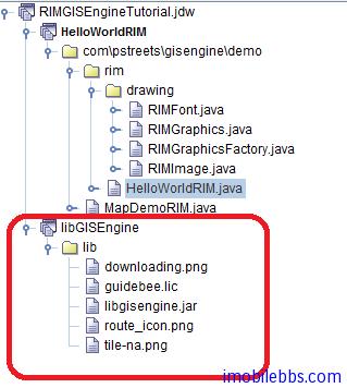 使用BlackBerry JDE 6.0.0创建一个新的Workspace, RIMGISEngineTutorial. 首先添加一个新的Lib项目libGISEngine, 在其中添加引路蜂开发库。然后添加HelloWorldRIM Blackberry应用,将libGISEngine设为项目HelloWorldRIM的依赖库(Project Dependencies).