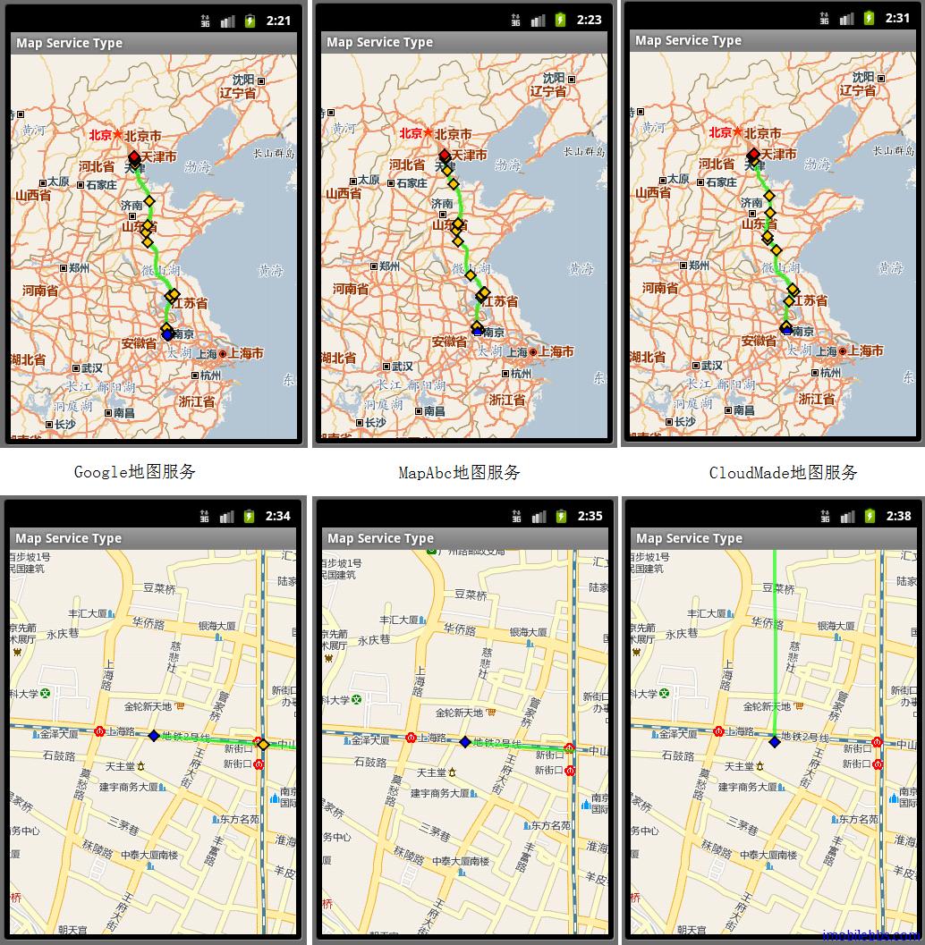 上图分别为三种地图服务返回的路径,Google 地图服务和MapAbc地图服务返回的结果基本相同,实际上Google 地图服务在中国的地图是来自于MapAbc。而CloudMade地图返回的结果似乎偏移了道路。这是因为Bing 中国地图是被偏移过的,而CloudMade返回的无偏移的结果。Google 地图服务和MapAbc地图服务返回的结果也是偏移过的,所以和偏移过的地图很“匹配”。