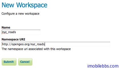 - 输入Name: nyc_roads ,URI: http://opengeo.org/nyc_roads, 这个URI可以用来唯一指定中个Workspace, http://opengeo.org可以替换成你自己的域名。