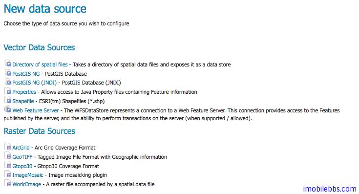 - 为了添加 nyc_roads 数据,需要在GeoServer中创建一个新的Data Store, 点击“Add new Store?按钮,可以看到GeoServer支持很多种数据源: PostGIS NG , Shapefiles 等等。
