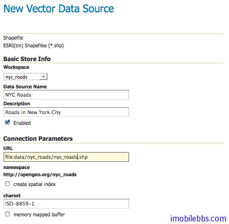 - 在?Connection Parameters?下指定nyc_roads.shp 的路径