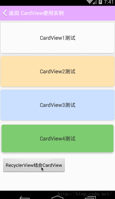 <?xmlversion="1.0" encoding="utf-8"?> <LinearLayoutxmlns:android="http://schemas.android.com/apk/res/android" xmlns:card_view="http://schemas.android.com/apk/res-auto" android:orientation="vertical" android:layout_width="match_parent" android:layout_height="match_parent"> <includelayout="@layout/common_top_bar_layout"/> <android.support.v7.widget.CardView android:layout_marginTop="3dp" android:layout_marginLeft="3dp" android:layout_marginRight="3dp" android:id="@+id/card_view_one" android:layout_gravity="center" android:layout_width="match_parent" android:layout_height="100dp" card_view:cardCornerRadius="5dp"> <TextView android:id="@+id/info_text_one" android:text="CardView1测试" android:textSize="16sp" android:gravity="center" android:layout_width="match_parent" android:layout_height="match_parent" /> </android.support.v7.widget.CardView> <android.support.v7.widget.CardView android:layout_marginTop="3dp" android:layout_marginLeft="3dp" android:layout_marginRight="3dp" android:id="@+id/card_view_two" android:layout_gravity="center" android:layout_width="match_parent" android:layout_height="100dp" card_view:cardCornerRadius="5dp" card_view:cardBackgroundColor="#FFE4B5"> <TextView android:id="@+id/info_text_two" android:text="CardView2测试" android:textSize="16sp" android:gravity="center" android:layout_width="match_parent" android:layout_height="match_parent" /> </android.support.v7.widget.CardView> <android.support.v7.widget.CardView android:layout_marginTop="3dp" android:layout_marginLeft="3dp" android:layout_marginRight="3dp" android:id="@+id/card_view_three" android:layout_gravity="center" android:layout_width="match_parent" android:layout_height="100dp" card_view:cardCornerRadius="5dp" card_view:cardBackgroundColor="#CAE1FF"> <TextView android:id="@+id/info_text_three" android:text="CardView3测试" android:textSize="16sp" android:gravity="center" android:layout_width="match_parent" android:layout_height="match_parent" /> </android.support.v7.widget.CardView> <android.support.v7.widget.CardView android:layout_marginTop="3dp" android:layout_marginLeft="3dp" android:layout_marginRight="3dp" android:id="@+id/card_view_four" android:layout_gravity="center" android:layout_width="match_parent" android:layout_height="100dp" card_view:cardCornerRadius="5dp" card_view:cardBackgroundColor="#7CCD7C" card_view:cardElevation="5dp" card_view:cardMaxElevation="5dp"> <TextView android:id="@+id/info_text_four" android:text="CardView4测试" android:textSize="16sp" android:gravity="center" android:layout_width="match_parent" android:layout_height="match_parent" /> </android.support.v7.widget.CardView> </LinearLayout>
