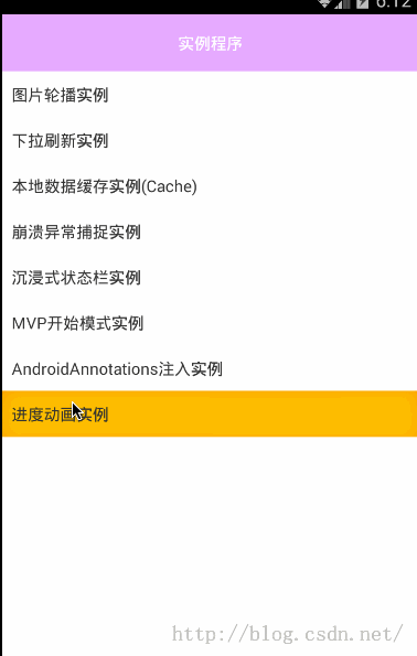 <?xmlversion="1.0" encoding="utf-8"?> <LinearLayoutxmlns:android="http://schemas.android.com/apk/res/android" xmlns:app="http://schemas.android.com/apk/res-auto" android:orientation="vertical"android:layout_width="match_parent" android:layout_height="match_parent"> <LinearLayout android:layout_width="fill_parent" android:layout_height="49dp" android:background="#e7abff" android:gravity="center" > <TextView android:layout_width="wrap_content" android:layout_height="wrap_content" android:layout_centerInParent="true" android:textColor="@color/white" android:text="进度动画实例"/> </LinearLayout> <ScrollView android:layout_width="fill_parent" android:layout_height="fill_parent"> <LinearLayout android:layout_width="fill_parent" android:layout_height="fill_parent" android:orientation="vertical"> <!--BallPulse--> <LinearLayout android:layout_width="fill_parent" android:layout_height="wrap_content" android:orientation="horizontal"> <TextView android:layout_width="wrap_content" android:layout_height="wrap_content" android:layout_centerInParent="true" android:textColor="@color/black" android:text="BallPulse:"/> <com.wang.avi.AVLoadingIndicatorView android:id="@+id/avloadingIndicatorView_BallPulse" android:layout_width="wrap_content" android:layout_height="wrap_content" android:visibility="visible" app:indicator="BallPulse" app:indicator_color="@color/red" /> </LinearLayout> <!--BallGridPulse--> <LinearLayout android:layout_width="fill_parent" android:layout_height="wrap_content" android:orientation="horizontal"> <TextView android:layout_width="wrap_content" android:layout_height="wrap_content" android:layout_centerInParent="true" android:textColor="@color/black" android:text="BallGridPulse:"/> <com.wang.avi.AVLoadingIndicatorView android:id="@+id/avloadingIndicatorView_BallGridPulse" android:layout_width="wrap_content" android:layout_height="wrap_content" android:visibility="visible" app:indicator="BallGridPulse" app:indicator_color="@color/red" /> </LinearLayout> <!--BallClipRotate--> <LinearLayout android:layout_width="fill_parent" android:layout_height="wrap_content" android:orientation="horizontal"> <TextView android:layout_width="wrap_content" android:layout_height="wrap_content" android:layout_centerInParent="true" android:textColor="@color/black" android:text="BallGridPulse:"/> <com.wang.avi.AVLoadingIndicatorView android:id="@+id/avloadingIndicatorView_BallClipRotate" android:layout_width="wrap_content" android:layout_height="wrap_content" android:visibility="visible" app:indicator="BallClipRotate" app:indicator_color="@color/red" /> </LinearLayout> <!--BallClipRotatePulse--> <LinearLayout android:layout_width="fill_parent" android:layout_height="wrap_content" android:orientation="horizontal"> <TextView android:layout_width="wrap_content" android:layout_height="wrap_content" android:layout_centerInParent="true" android:textColor="@color/black" android:text="BallClipRotatePulse:"/> <com.wang.avi.AVLoadingIndicatorView android:id="@+id/avloadingIndicatorView_BallClipRotatePulse" android:layout_width="wrap_content" android:layout_height="wrap_content" android:visibility="visible" app:indicator="BallClipRotatePulse" app:indicator_color="@color/red" /> </LinearLayout> <Button android:id="@+id/progress_start" android:layout_width="wrap_content" android:layout_height="wrap_content" android:text="打开动画"/> <Button android:id="@+id/progress_stop" android:layout_width="wrap_content" android:layout_height="wrap_content" android:text="关闭动画"/> </LinearLayout> </ScrollView> </LinearLayout>
