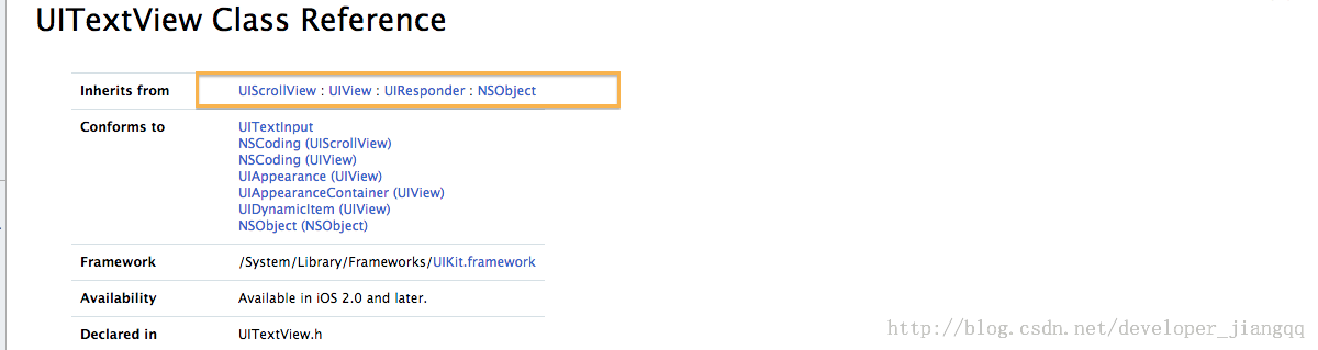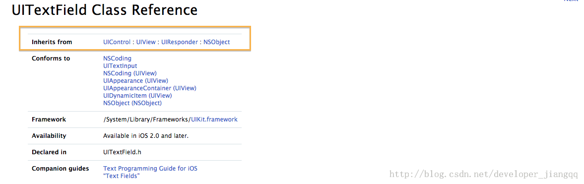 1:看了之前的UIView的类继承层次图之后,我们可以很清楚的看到UITextField是继承自UIControll控件.(查看文档UITextField官方文档)