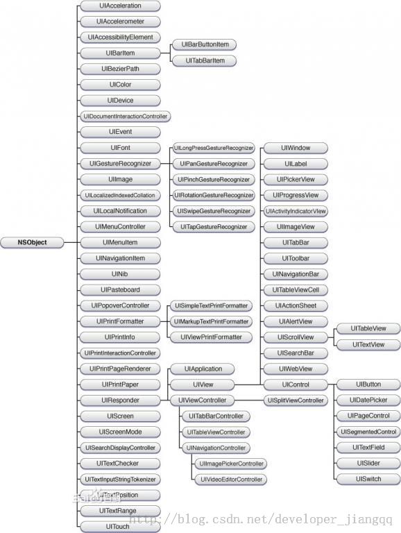 (一) :做IOS开发,我们主要使用到UIKit框架,在UIkit框架中UIView是所有视图的根类.首先看下UIKit的框架类继承图;