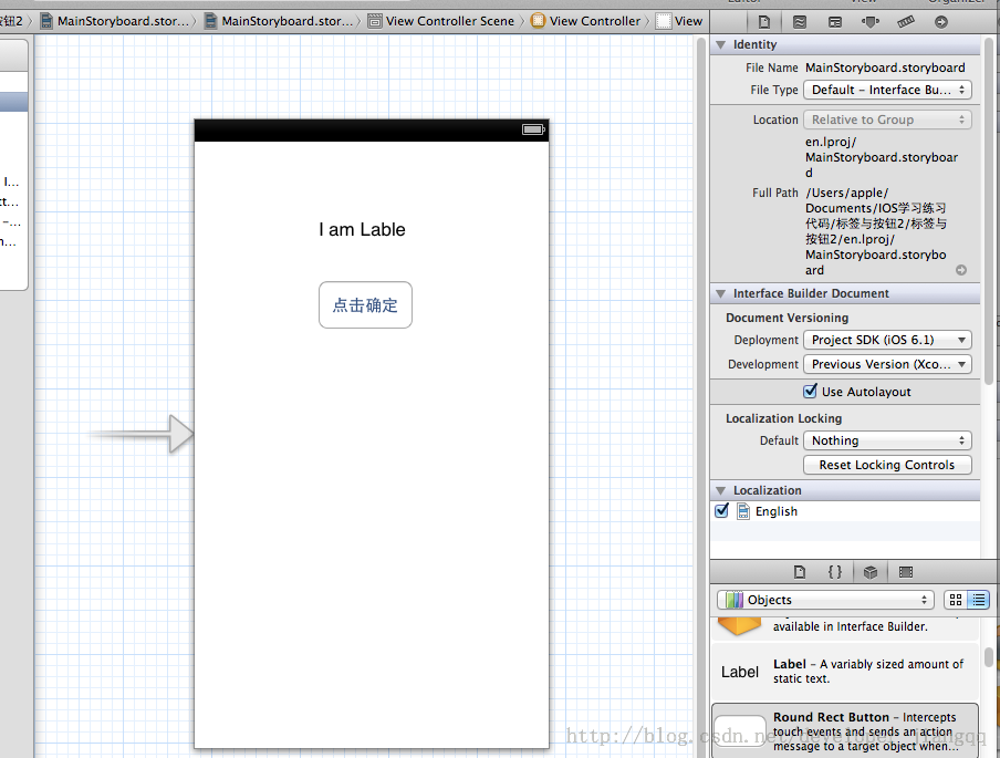 步骤:创建项目->打开MainStoryBoard.stroyboard(故事板),从对象库中分别拉一个Lable,双击修改里边的文本,同样的方便创建一个Button.如下: