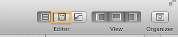 我们需要给标签定义一个输出口,给按钮定义动作,在xcode的右上角,点击辅助框(如下图:黄色框框)