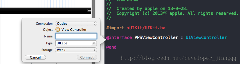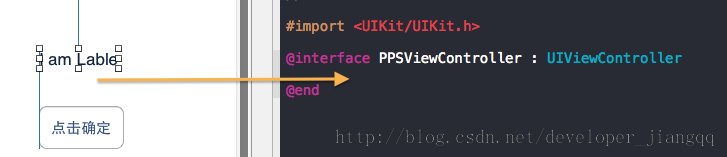 ②:上面的动作创建好了,那我们需要去访问例如一些UILabel之类的控件,那我们需要为该控件定义输出口,如上面的生成的代码: