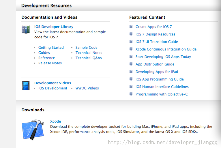 进去之后,可以点击登录,接下点击Xcode->点击View downloads->选择自己要的版本进行下载(我是用的是xcode4.6版本)[注:你还可以在App Store上面进行搜索xcode下载安装]