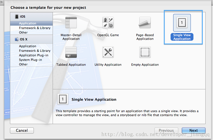 启动Xcode->New->Project:接下来出现一个choose a template for your new project的对话框: