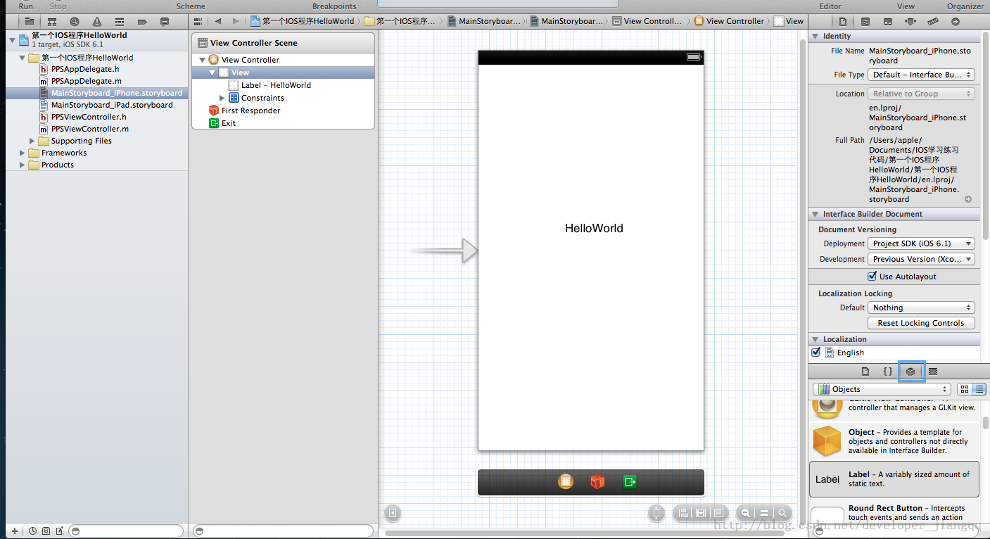 下面我们在View上面添加一个Lable标签:显示HelloWorld。方法:右下角的那个有立体感的下方块(显示对象库)->点击Lable控件->然后拉到View试图中->点击修改编辑里边的内容为:HelleWorld。如下图显示(特别注意右下角蓝色框框)