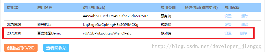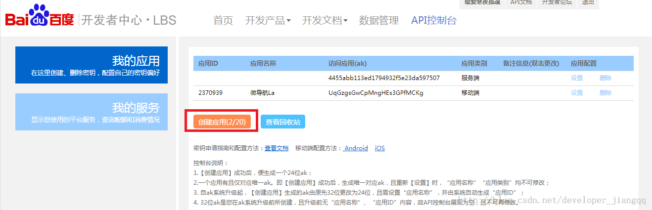 1:在我们使用百度地图之前,首先我们需要去BaiduMapSdK官方网站中申请key(地址为:http://lbsyun.baidu.com/apiconsole/key),看到如下界面点击创建应用,填写应用名称.