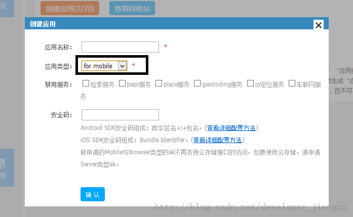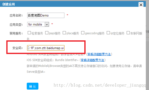 3:在之前的步骤中输入安全码,sha1值+我创建的应用的包名,点击确认,这样就配置OK了:截图如下: