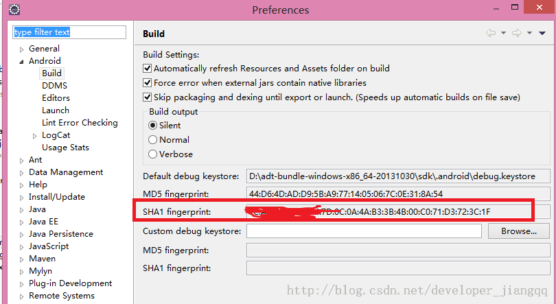 2:开始配置应用,我们需要配置我们应用的安全码(形式为:输入“安全码”。安全码的组成规则为:Android签名证书的sha1值+“;”+packagename(即:数字签名+分号+包名))安全码的获取方式如下:我们这边使用Eclipse直接查看: winows -> preferance-> android -> build。 如下图示: