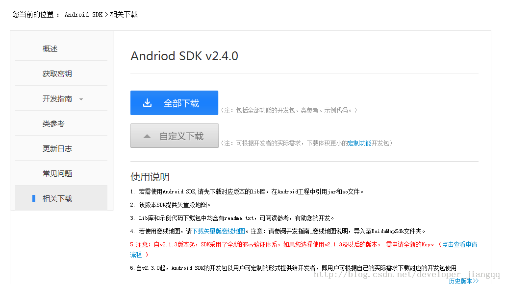 我们要使用Baidu地图开发,我们首先要去下载开发sdk库,下载地址:http://developer.baidu.com/map/sdkandev-download.htm,注意:为了给用户提供更优质的服务,Android SDK自v2.1.3版本开始采用了全新的Key验证体系。因此,当您选择使用v2.1.3及之后版本的SDK时,需要到新的Key申请页面进行全新Key的申请,申请及配置流程请参考开发指南对应章节 。(选择使用v2.1.2及之前版本SDK的开发者,申请密钥(Key)的方式不变)。